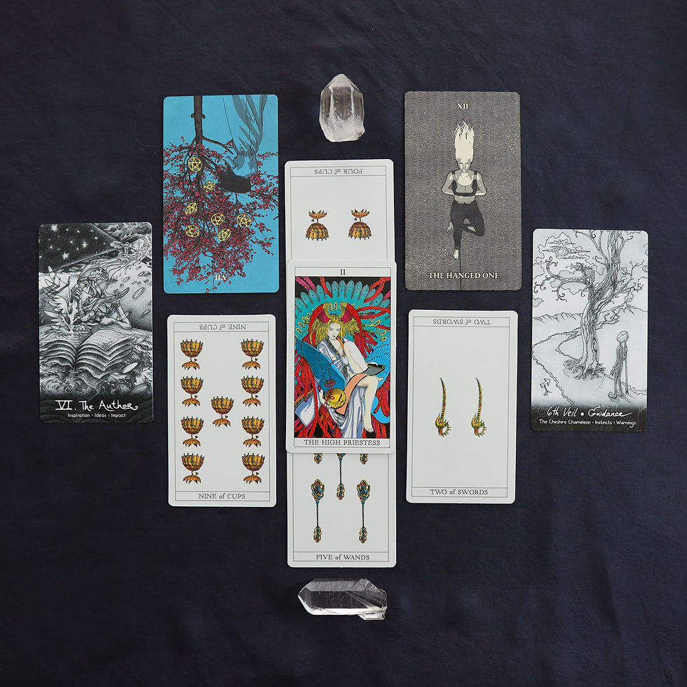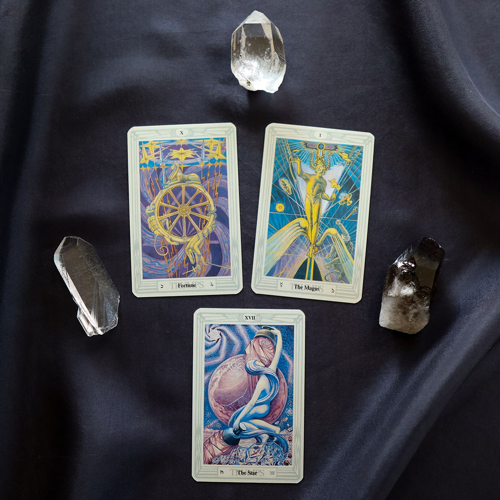 The present is not disconnected from the future, nor the past–the tarot doesn’t exist outside of time, but its capacity to predict the future is limited, because we are in a constant state of flux. At any moment in time, there may be multiple timelines being energized by our choices and the varied forces that influence our lives. The way I conceptualize my tarot practice with regard to time is as a sort of timeline alignment: the tarot presents us with the divine invitations that are most in alignment with our highest and best outcomes. Working with the tarot helps us to jump timelines, to deeply align with our soul, and to course-correct, by adjusting our orientation to what is here and now, rather than by trying to predict the future. The tarot is always helping us to align with the best possible outcome, with our dharma, and our destiny. It’s a portal of sorts, with the potential to help us narrow the gap between where we are and who we’re becoming, just not in a straightforward, predictive way.